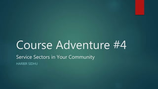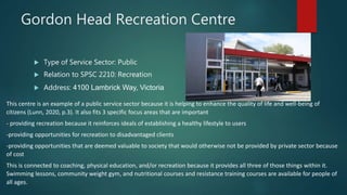 This document describes 7 service sectors in the community - 3 public sectors (Gordon Head Recreation Centre, Mount Douglas Secondary School, Oak Bay Recreation Centre), 2 commercial sectors (Orange Theory Fitness, Vancouver Whitecaps Youth Team), and 2 voluntary sectors (Sport BC, Canadian Sport Institute Pacific). Each sector is summarized with its address and relation to physical education, recreation, and/or coaching. The sectors provide various recreation, sports, education and training opportunities to the community.