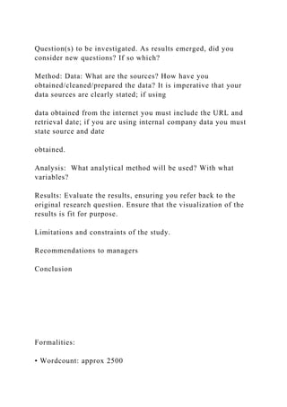 The document outlines a quantitative research project assignment for the course MCO 105, focusing on data analysis for managers, due in Week 10. It requires an investigation of a business problem utilizing time-series data that includes the year 2021, with a clear structure for the report including sections like executive summary, methodology, analysis, and recommendations. The assignment is worth 100% of the total grade and includes specific formatting and citation style requirements, as well as a rubric for evaluation.