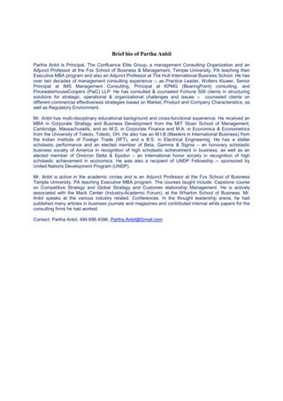 This document summarizes an MBA elective course on the globalization of emerging markets. The course will examine the business environment and opportunities in emerging economies like Brazil, Russia, India, China, and Turkey. Students will learn about developing effective strategies for both domestic and foreign companies operating in emerging markets. The course will be taught by Partha Anbil, an experienced management consultant and adjunct professor with expertise in competitive strategy and global business.