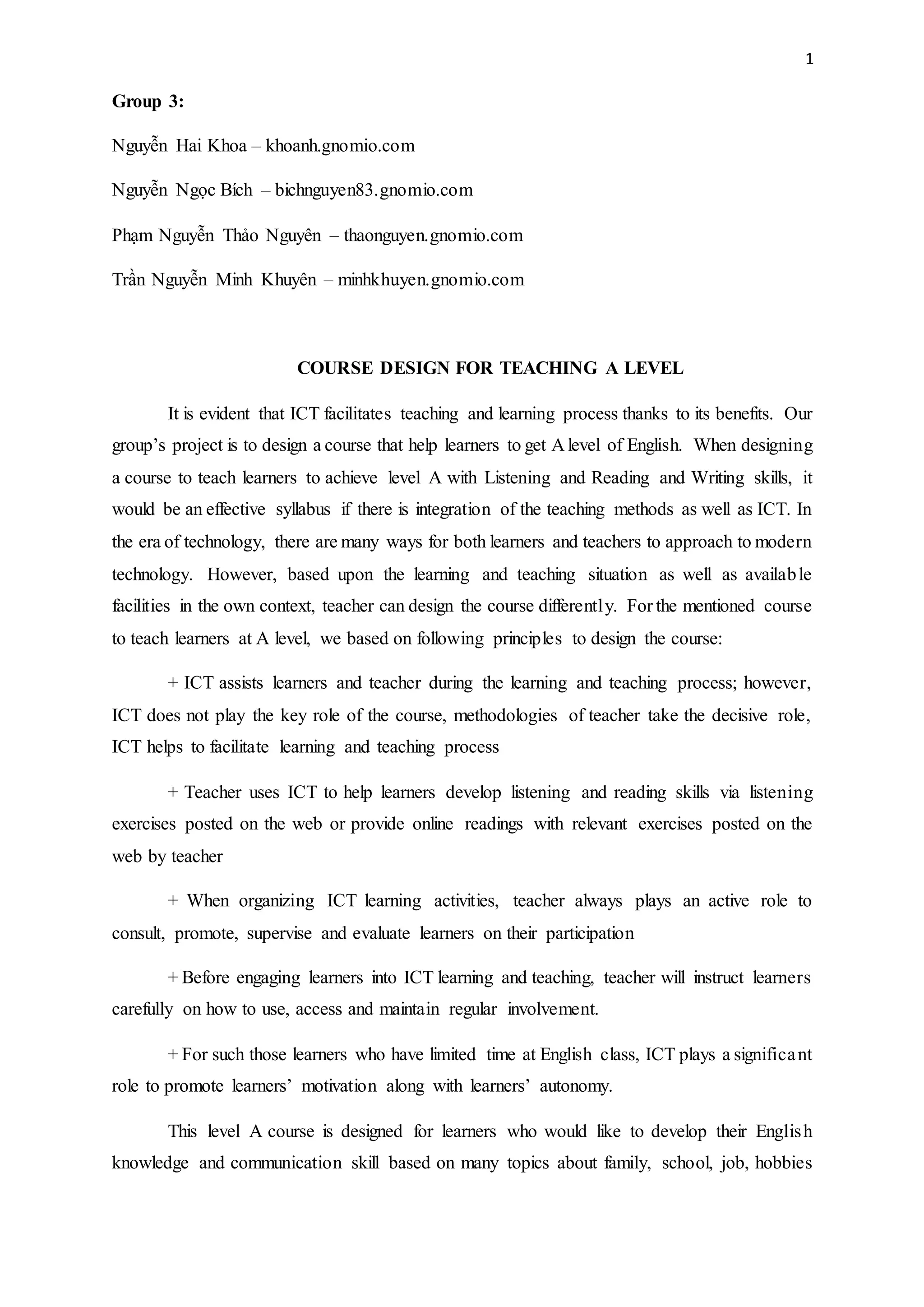 This document describes a course designed to teach English at an A level to learners in Vietnam. The course utilizes ICT like Moodle to facilitate learning and overcome limitations of classroom time. It includes 9 units covering topics like greetings, jobs, and daily routines. Three sample units are described in detail, outlining their lessons, learning objectives, and vocabulary. ICT like online exercises and quizzes are meant to supplement classroom learning and promote learner motivation and autonomy. The goal is for learners to communicate confidently in English after completing this course.