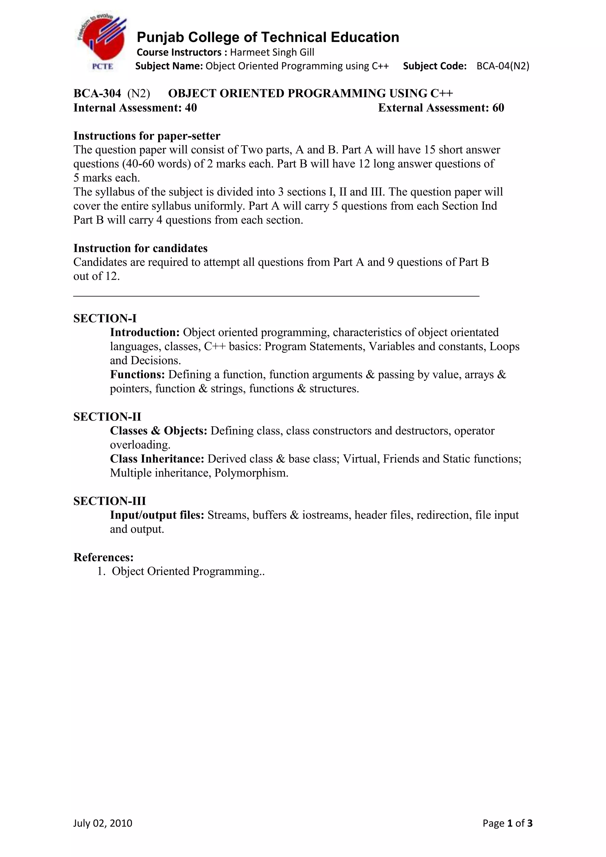 The document outlines the syllabus for an Object Oriented Programming using C++ course. It is divided into 3 sections - Introduction to OOP concepts and C++ basics, Classes and Objects, and Input/Output files. Section I covers OOP characteristics, C++ program statements, functions, arrays and pointers. Section II covers classes, objects, inheritance, polymorphism and static/friend functions. Section III discusses file I/O using streams in C++. The question paper for internal assessment will have 2 parts - short questions from each section in Part A and longer questions covering all sections in Part B.