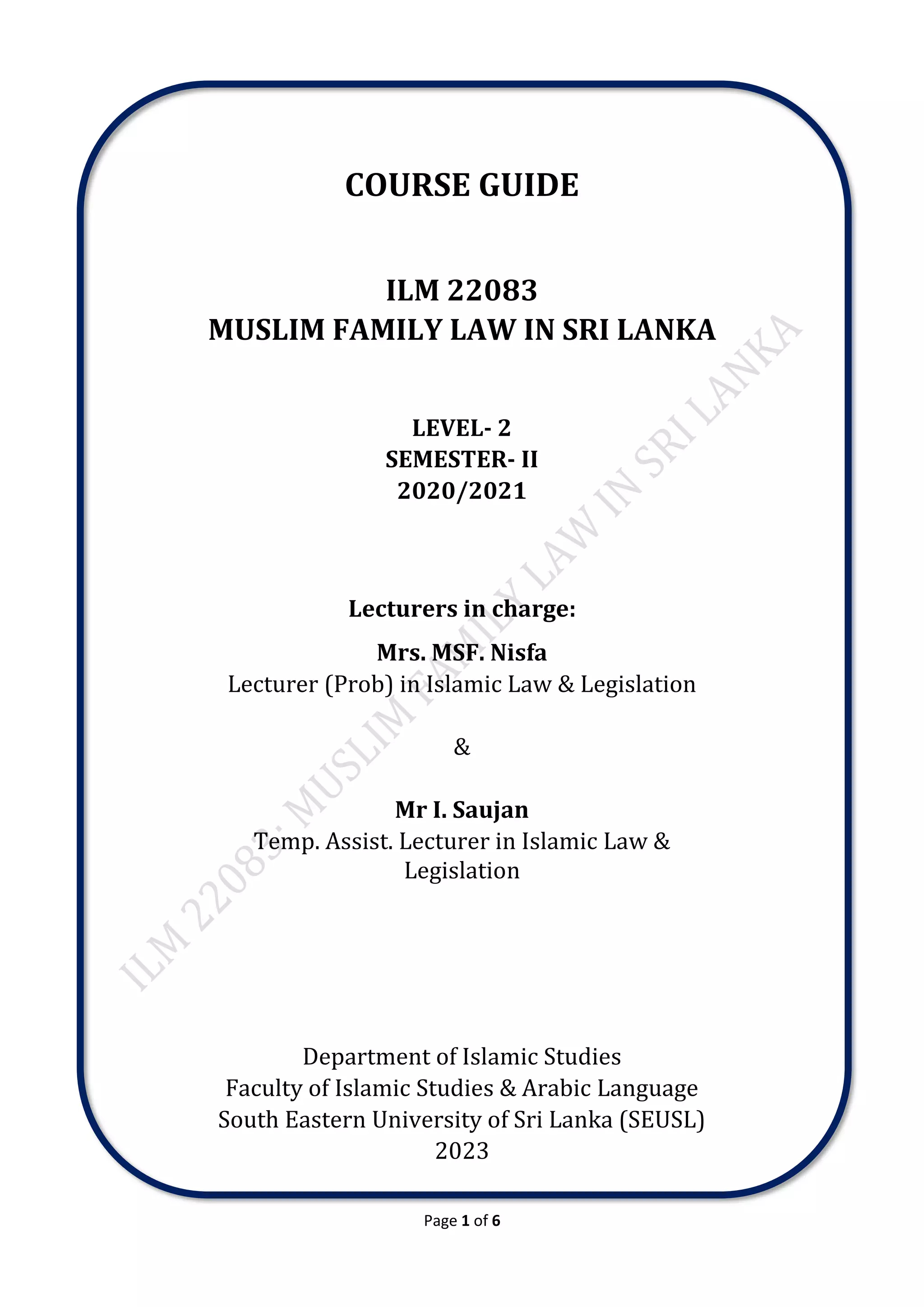 This document provides a course guide for the course "Muslim Family Law in Sri Lanka" taught at the South Eastern University of Sri Lanka. The course is a 3-credit, 45-hour course offered to Bachelor of Arts (Honours) in Islamic Law & Legislation students. It will examine laws relating to marriage, divorce, adoption, and other family matters within the Islamic legal framework and Sri Lankan legal system. Students will analyze sources of family law in Sri Lanka's pluralistic system and apply their knowledge to solve legal disputes. Assessment methods include a final exam, assignments, presentations, and continuous assessments. Required readings and online resources are also listed to support student learning in this area of Islamic jurisprudence and family