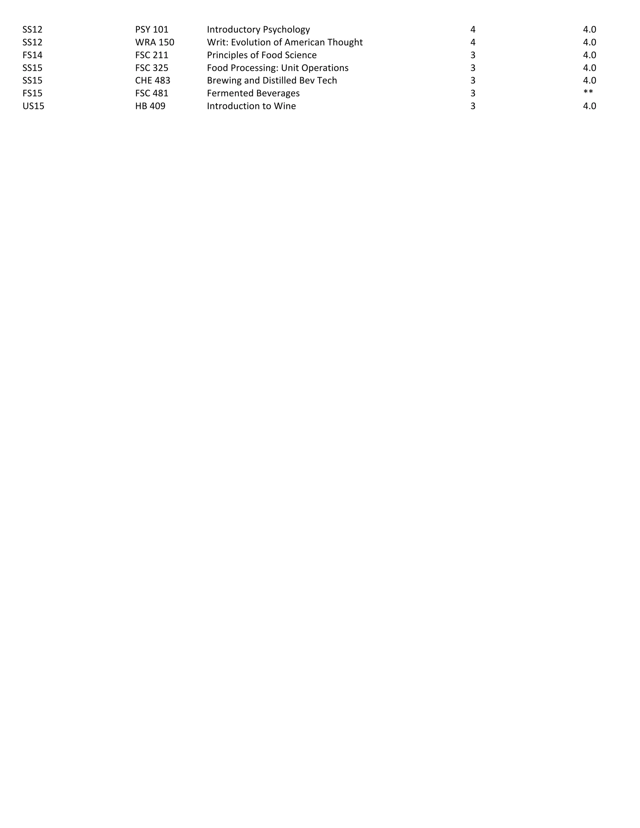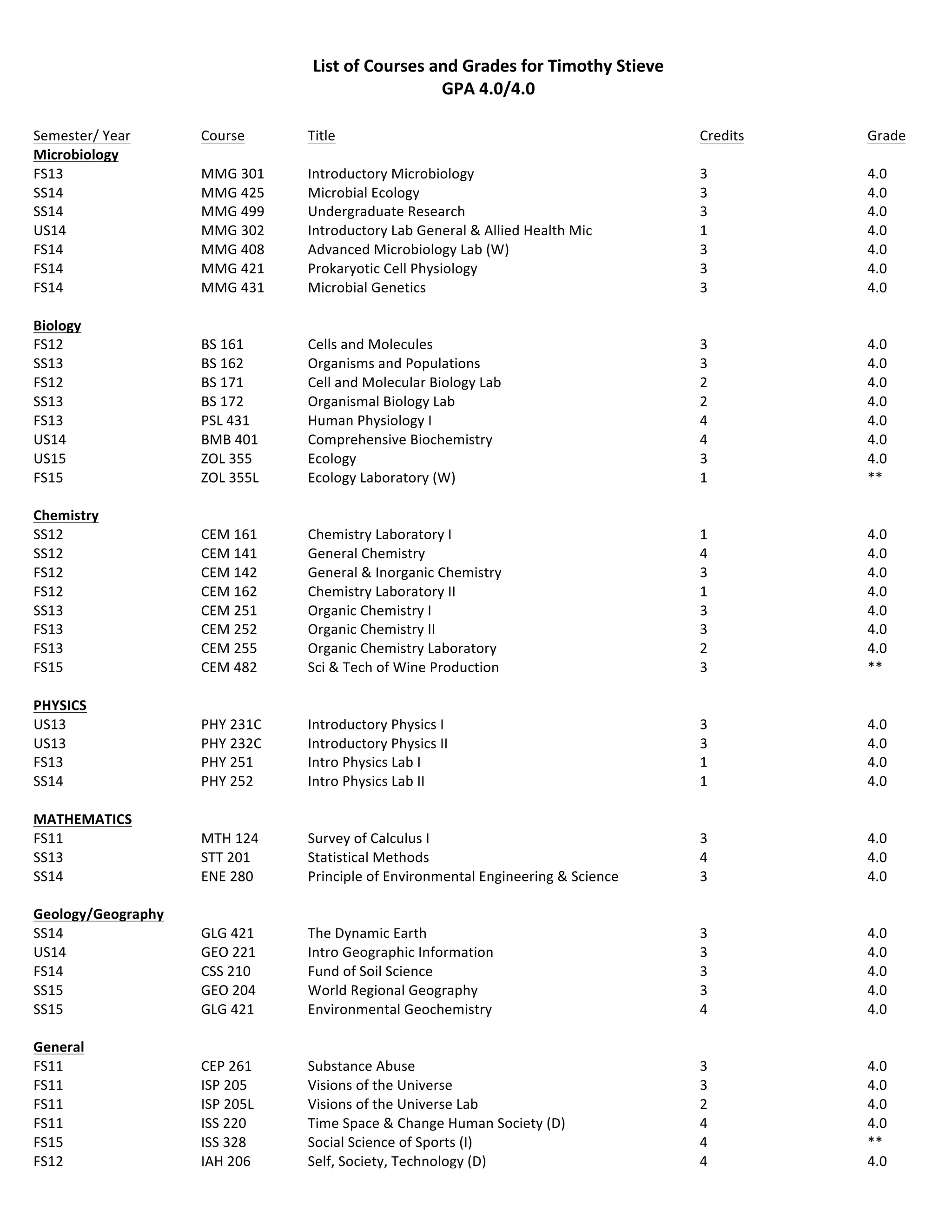 This document contains Timothy Stieve's transcript listing the courses he has taken, credits earned, and grades received. He has maintained a 4.0 GPA over 8 semesters taking courses in microbiology, biology, chemistry, physics, mathematics, geology/geography, and general education with grades of 4.0 or higher in most courses. His coursework has focused on microbiology, biology, chemistry, and food science.