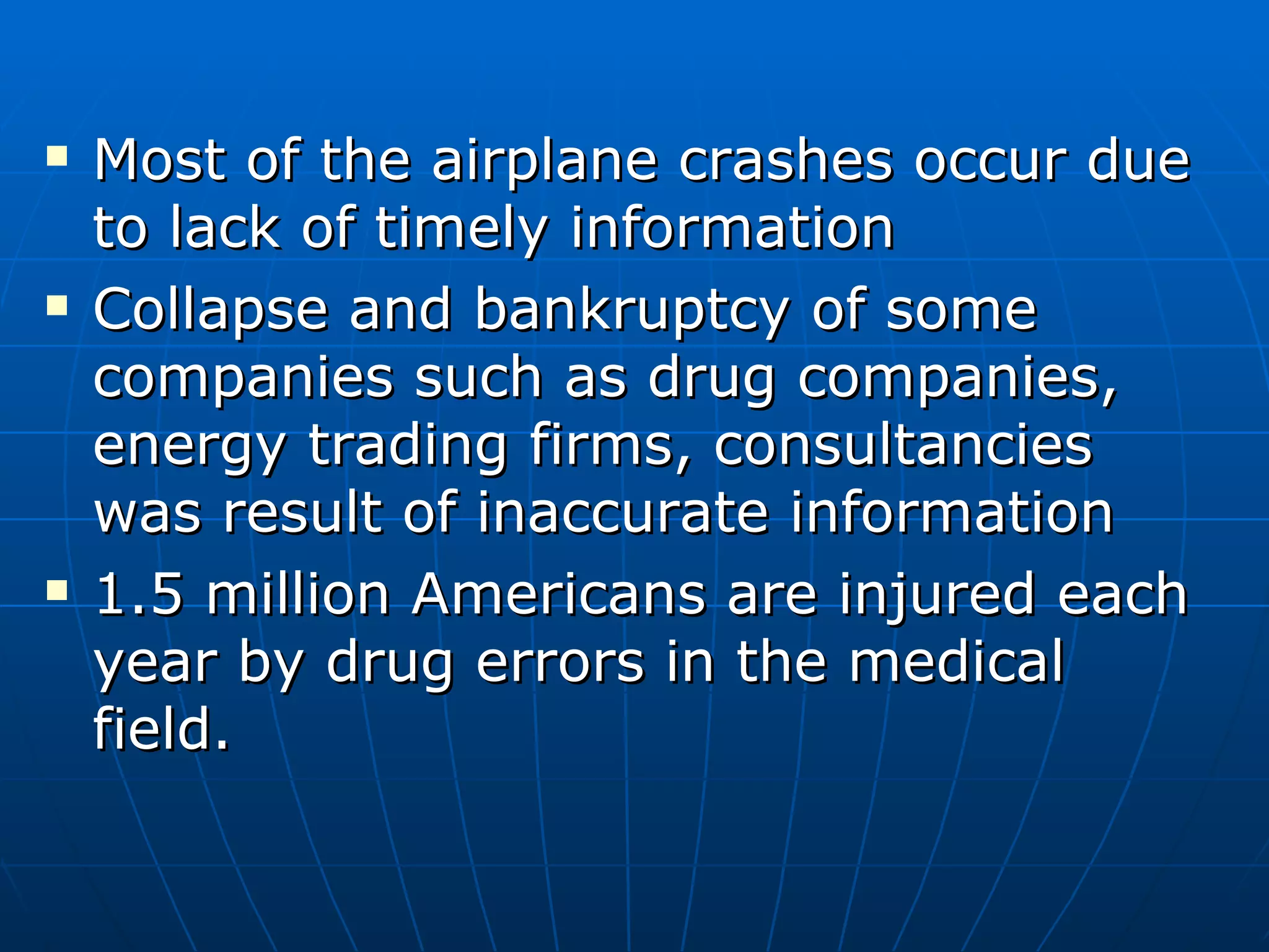 Most airplane crashes occur due to a lack of timely information which can also cause company bankruptcies and medical errors. Management information systems are used in nearly every industry and aspect of life to provide important updates and track essential data. However, proper attendance, testing, and maintenance of information system files are necessary for students to succeed in their coursework.