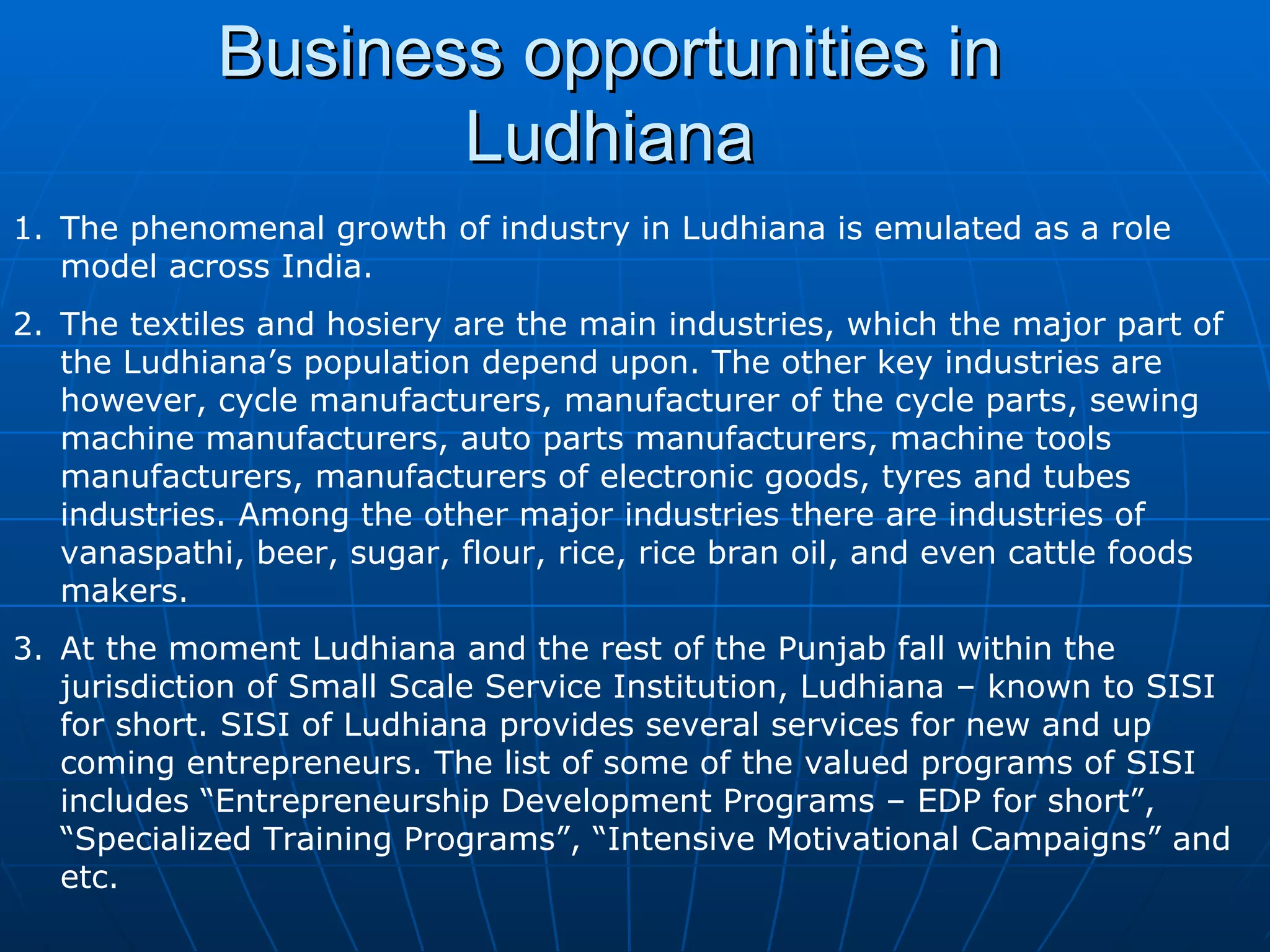 Ludhiana, India has experienced phenomenal industrial growth, led by the textiles and hosiery industries which many residents depend on for employment. Other major industries include bicycle manufacturing, auto parts, electronics, and food processing. Various government institutions provide support services to encourage entrepreneurship, such as training programs and helping new businesses with necessary skills and formalities.