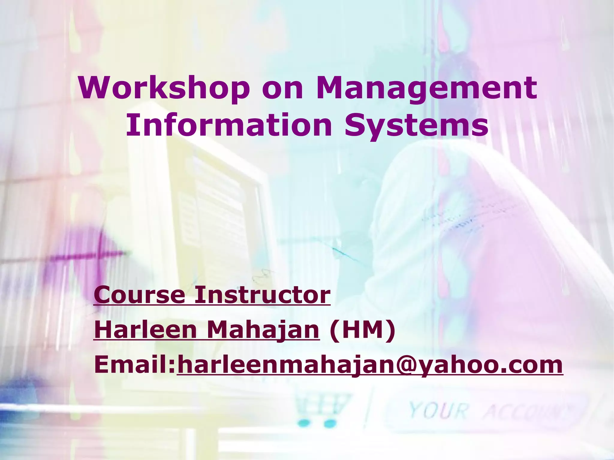 The document provides information about a workshop on management information systems including the course instructor's contact details, an overview of the use of information systems in different industries, classroom policies, grading criteria, recommended books and journal articles, online resources, and the lesson plans covering various topics like introduction to information systems, decision making, database management, systems analysis and design, and managing the digital firm. Assignments include making video CVs, individual blogs, financial statement analysis, e-commerce website design, and presentations on topics related to the use of information systems in different organizations.