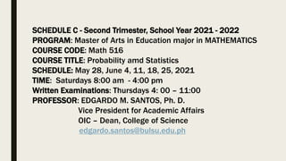 This document provides an orientation for a Probability and Statistics course. It outlines the course schedule, instructor information, learning outcomes, assignments, assessments, grading system, and policies. The course introduces concepts of probability, random variables, probability distributions, and mathematical expectations. It will be taught on Saturdays in May and June 2021 and will include exams, problem sets, and a research paper. Students will learn counting techniques, probability laws, discrete and continuous distributions, and their applications. Attendance and participation are required.
