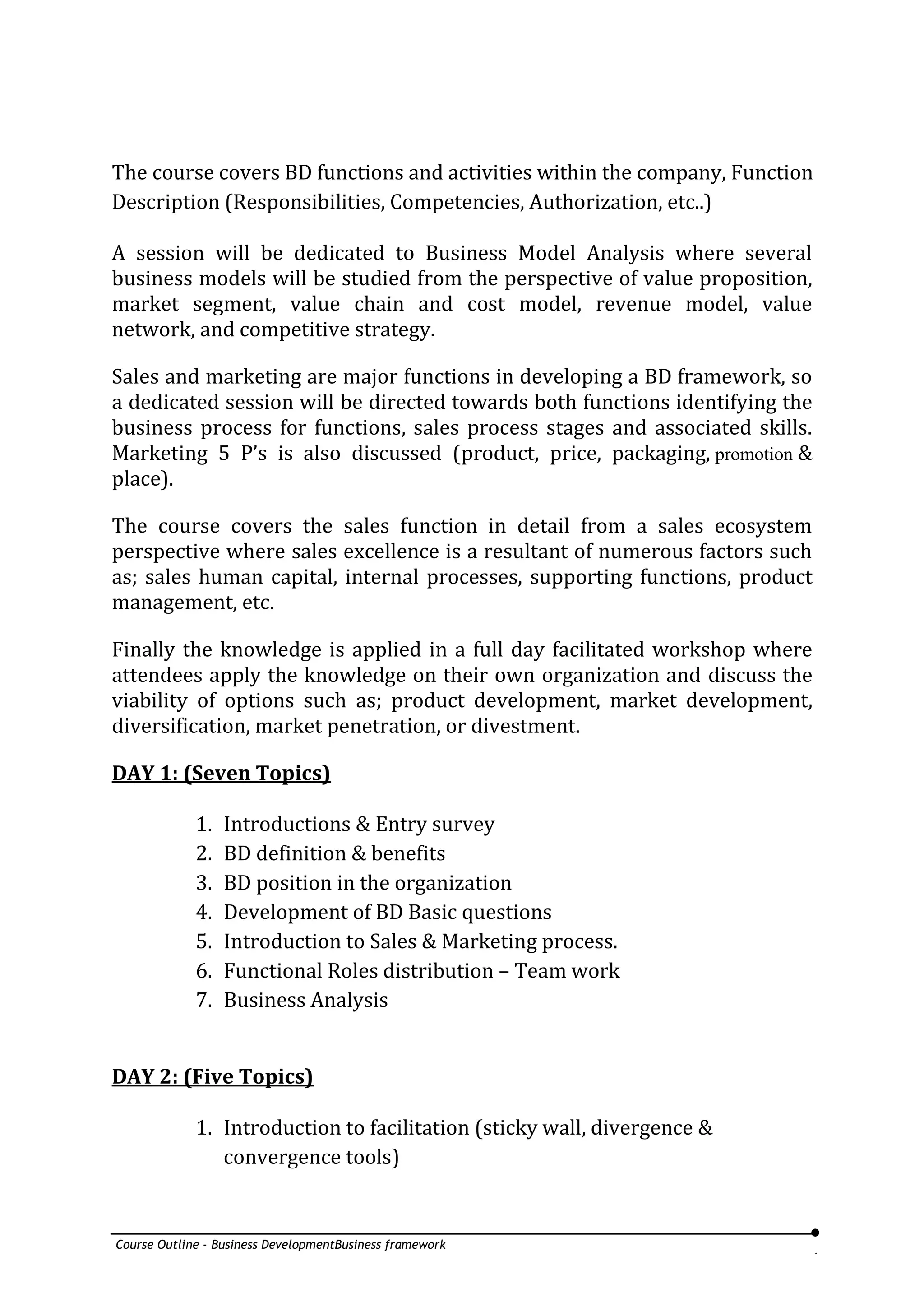 The document outlines a business development framework course aimed at enhancing professionals' skills in expanding organizational reach and strengthening client relationships. It covers topics such as the sales and marketing processes, business model analysis, and various analytical tools, culminating in a workshop to apply learned concepts. The course is designed for advanced professionals in sales, marketing, and strategic planning and spans three days.