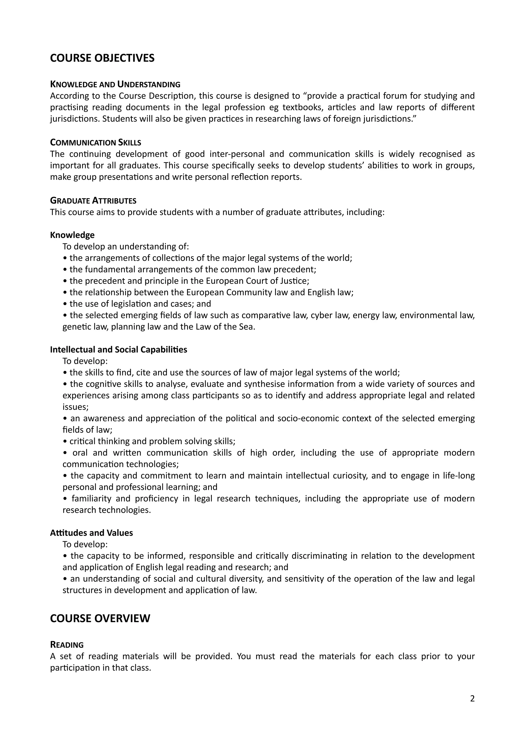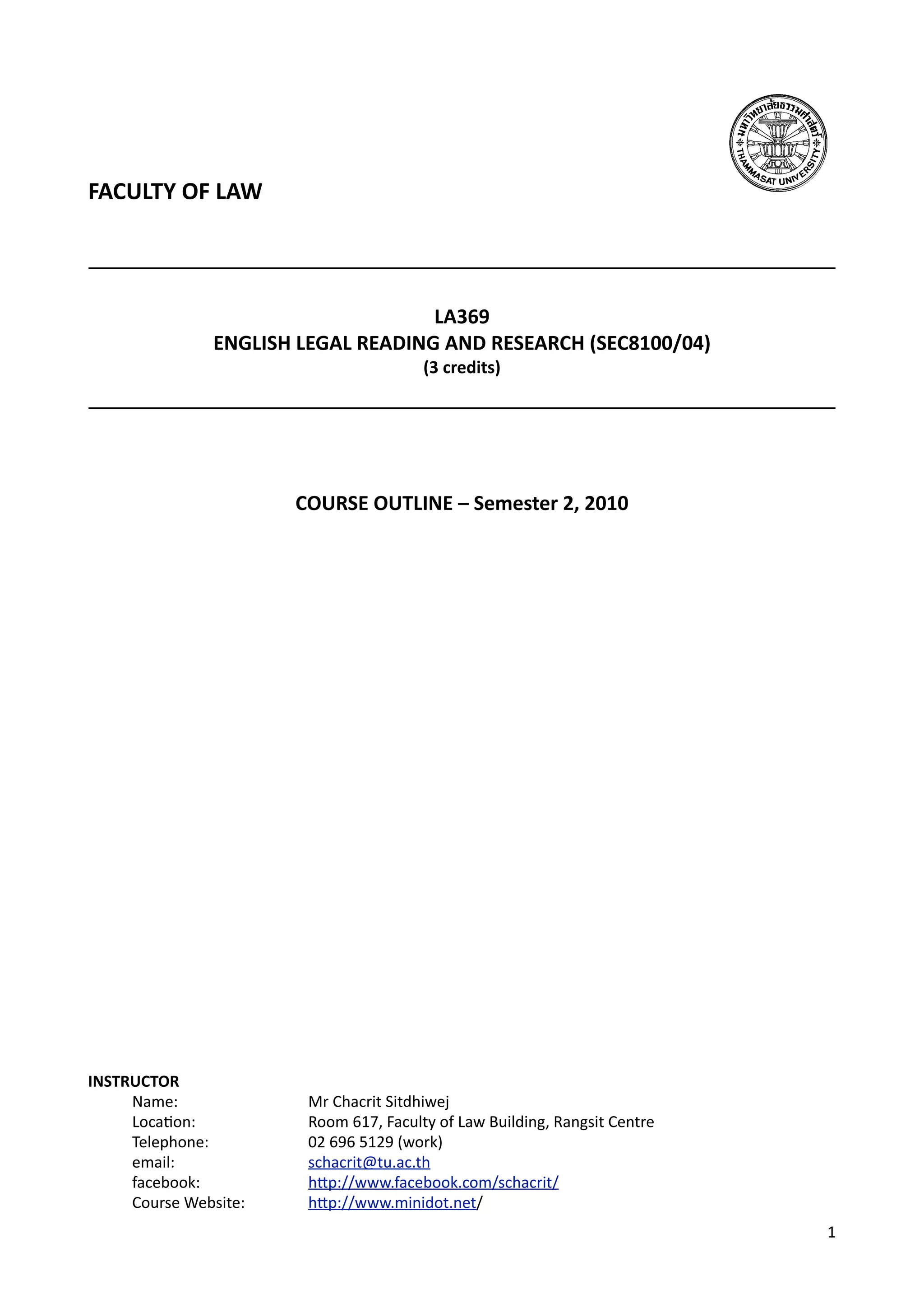 This document provides the course outline for LA369 English Legal Reading and Research at the Faculty of Law. The course aims to develop students' legal reading, research, communication, and analytical skills. It will cover topics such as legal systems, precedent, legislation, and emerging fields of law. The course involves weekly lectures and workshops over 16 weeks. Students will complete reflective reports and group presentations. The course does not require textbooks but recommends two for additional reference. Classes will be held on Mondays at 9:30am, except for weeks 10-15 which will start at 9:00am to make up for public holidays.