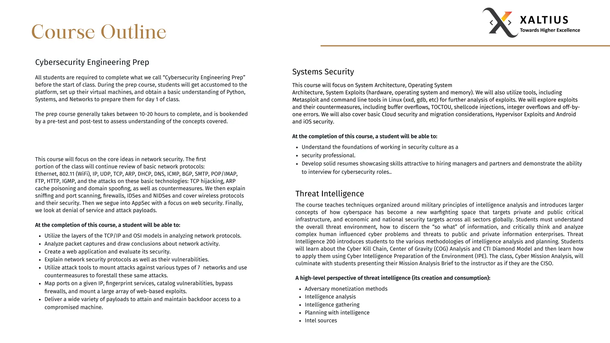 This document outlines several cybersecurity engineering course outlines that cover topics such as cybersecurity engineering prep, network security, system architecture and exploits, governance risk and compliance, logs and detection, Python programming, application security and penetration testing, and applied cryptography. The courses provide learning objectives and focus areas within each topic.