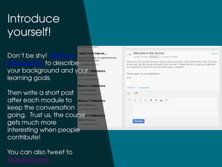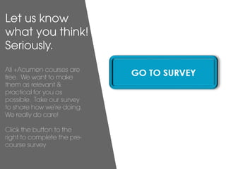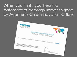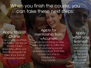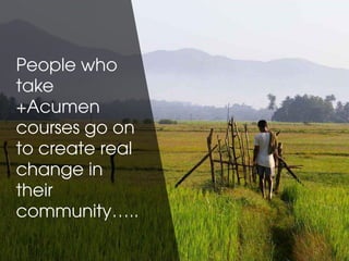 This document provides tips for finding a team to take an Acumen online course with. It describes how taking the course with a team can provide a more rewarding experience and allow people to learn more. It then provides suggestions for finding a team such as emailing friends, creating a meetup group in your city, or setting up virtual meetings online with others taking the course. The document emphasizes that the course is self-facilitated and those who put in the most effort will get the most out of it.