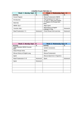 The document provides a course plan for BIN-14 over two weeks. Week 1 includes an introduction to the course, materials, and a YouTube video on the history of English. Students will read the first chapter of Frankenstein and the first episode of How I Met Your Mother. Week 2 consists of assignments on phrasal verbs, syllabic consonants, objectives in linguistics, and continuing discussions of Frankenstein and assigned media. Students will complete quests and readings for homework each week.