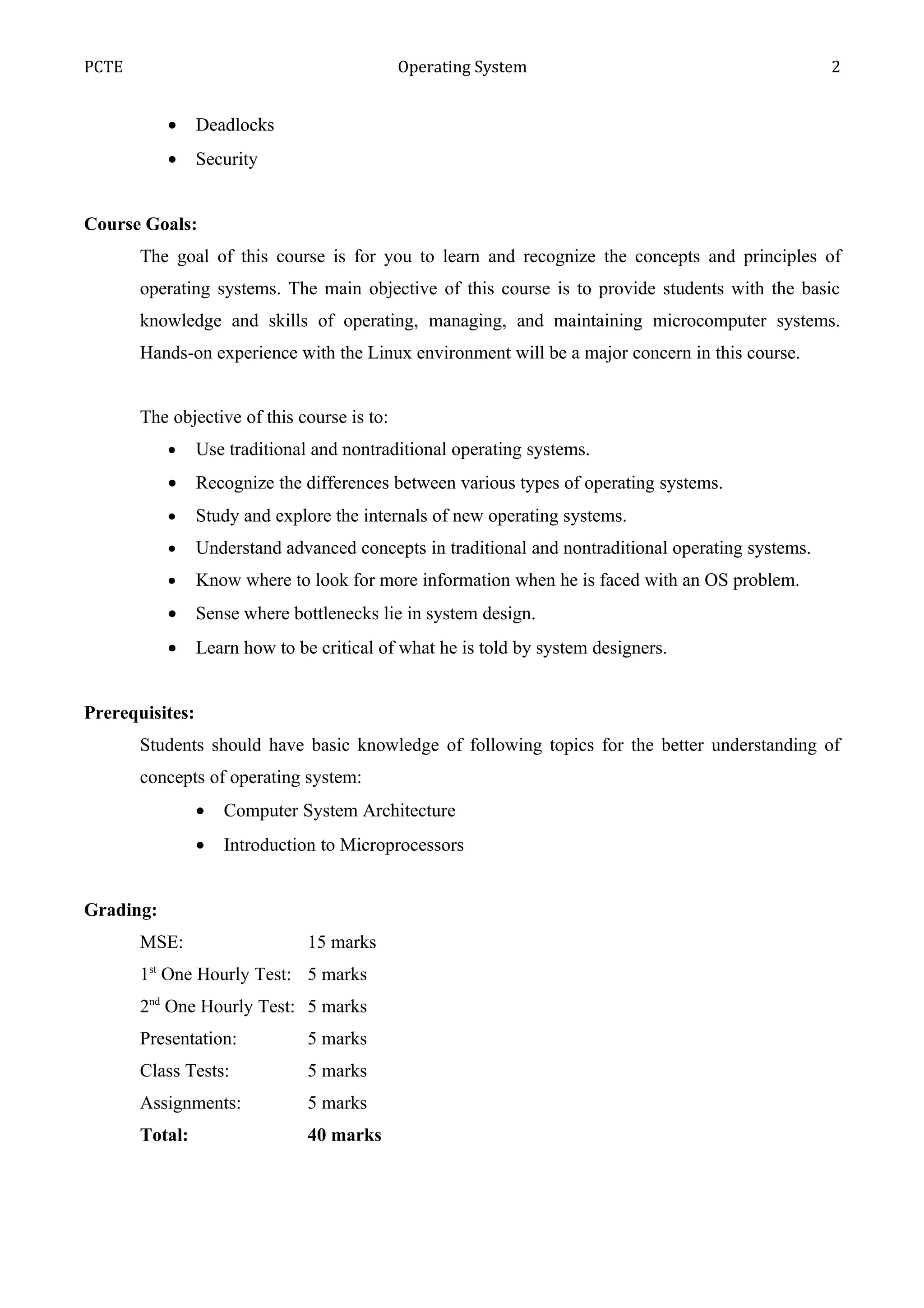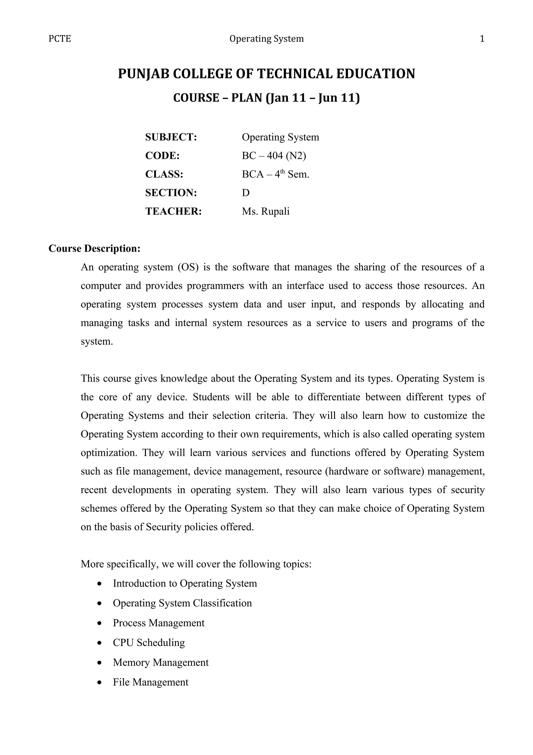 The document provides details about an Operating Systems course being taught at Punjab College of Technical Education. It includes the course code, class, section, teacher, topics to be covered, course goals, prerequisites, grading criteria, rules for assignments, tests, a presentation, class participation, classroom policies, and a course breakup schedule. The main topics to be covered are introduction to operating systems, process management, CPU scheduling, memory management, file management, deadlocks, and security. The goal is for students to learn operating system concepts and principles with hands-on experience using Linux. Grading will include assignments, tests, a presentation, and class participation.
