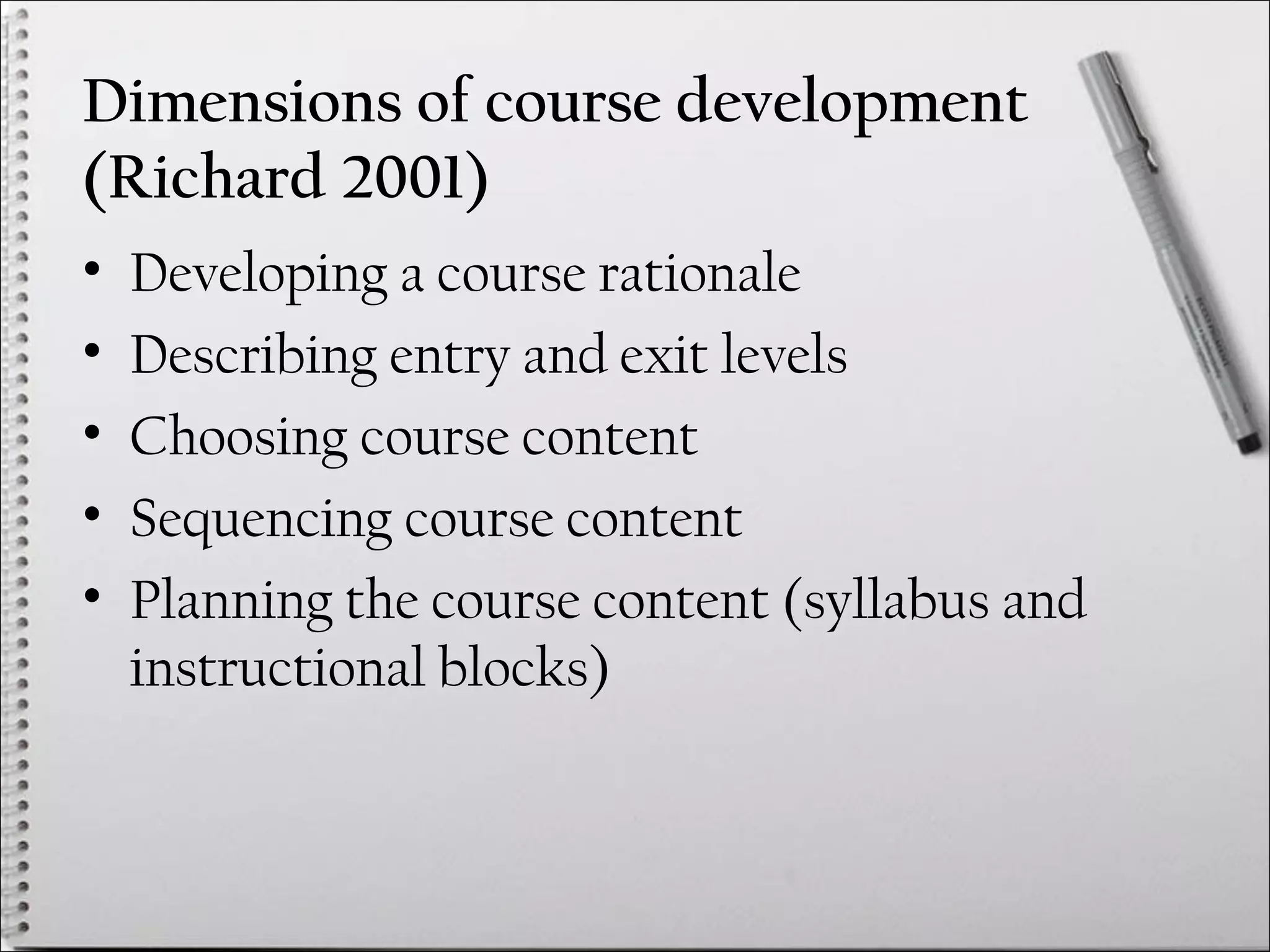 The document discusses course planning and syllabus design. It covers developing a course rationale, describing entry and exit levels, choosing course content, sequencing content, and planning the syllabus. A course rationale answers questions about who the course is for, what it covers, and what teaching and learning will occur. It guides planning and provides focus. Entry and exit levels describe student proficiency before and after a course. Course content choices are based on objectives and needs. The document also reviews the Philippines' previous and current basic education curriculums.