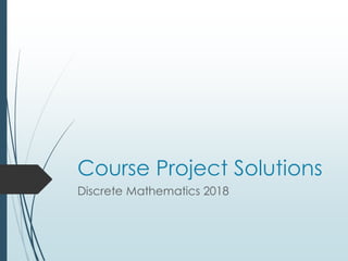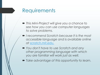 This document provides instructions and materials for a course project on solving problems using computer programming. It includes two problems - counting prime numbers below 10,000 and counting triangular numbers below 1,000,000. Algorithms are presented for both problems using pseudocode. Students are instructed to implement the algorithms in Scratch or another programming language. Sample Scratch and Python programs are included, along with testing to validate the outputs against known results. The document aims to help students learn programming skills through solving mathematical problems.