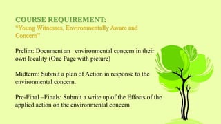 This course requires students to document an environmental concern in their local area in a one-page preliminary report including a picture. For the midterm, students must submit a plan of action to address the concern. To complete the course, students will write a report on the effects of implementing their action plan on the environmental concern.