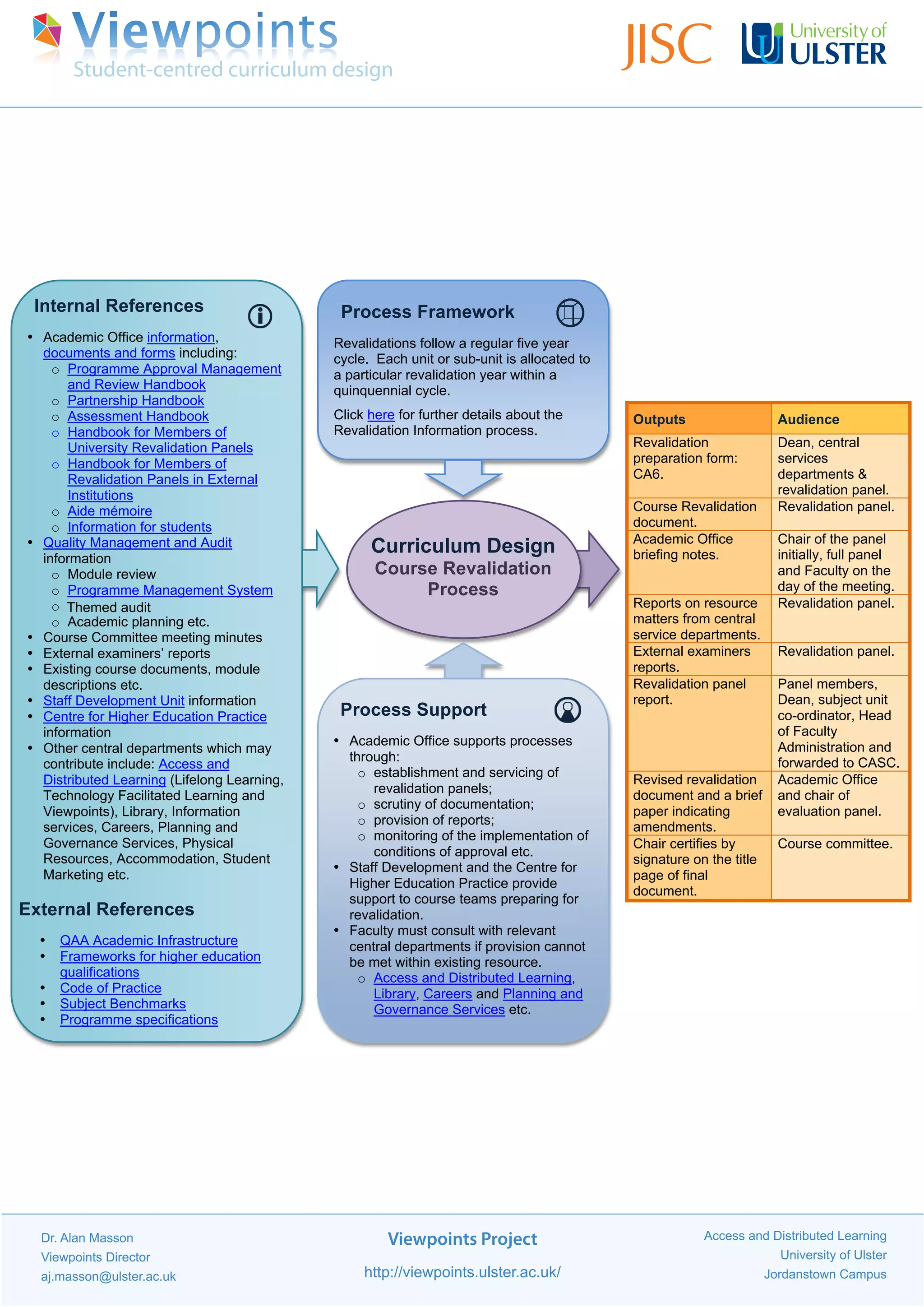 The document outlines the student-centered curriculum design and revalidation process at the university. It provides references and resources to guide course teams through preparing for the regular five-year revalidation cycle where each unit or sub-unit is reviewed. The academic office supports the process by establishing panels, scrutinizing documentation, and monitoring approval conditions, while other departments provide input on resources and the staff development unit assists course preparation. The process aims to design curricula aligned with quality standards and student needs.