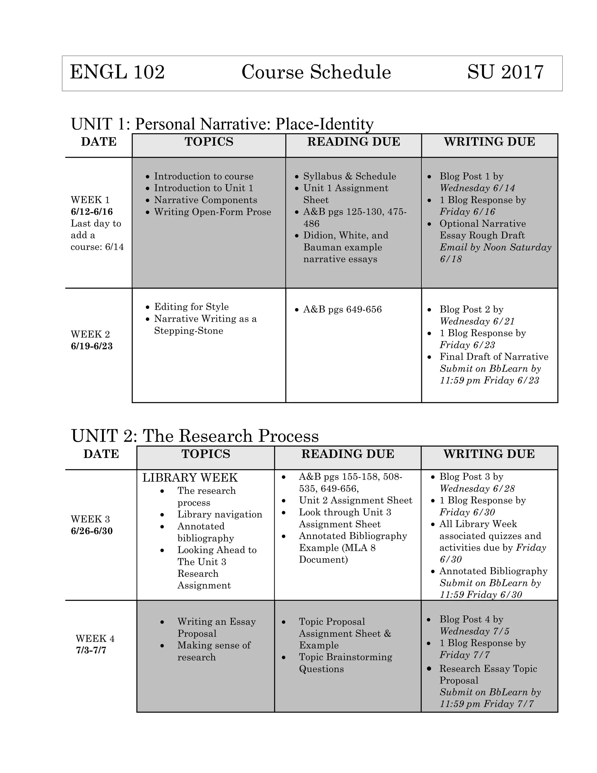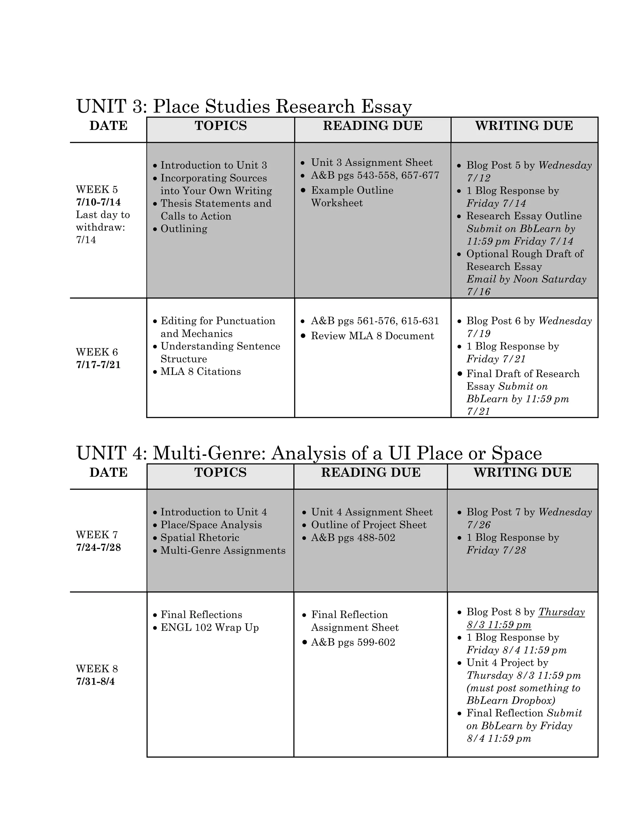 This document outlines the schedule and assignments for an English composition course divided into four units. The first unit focuses on personal narratives and place-identity. It includes two blog posts, responses, and a final narrative draft. The second unit covers the research process, including an annotated bibliography and topic proposal. The third unit is a place studies research essay with an outline and final draft. The fourth and final unit is a multi-genre analysis of a local place or space, with an outline and completed project. The course concludes with final reflections. Key due dates are provided for all reading responses, writing assignments, and project drafts.
