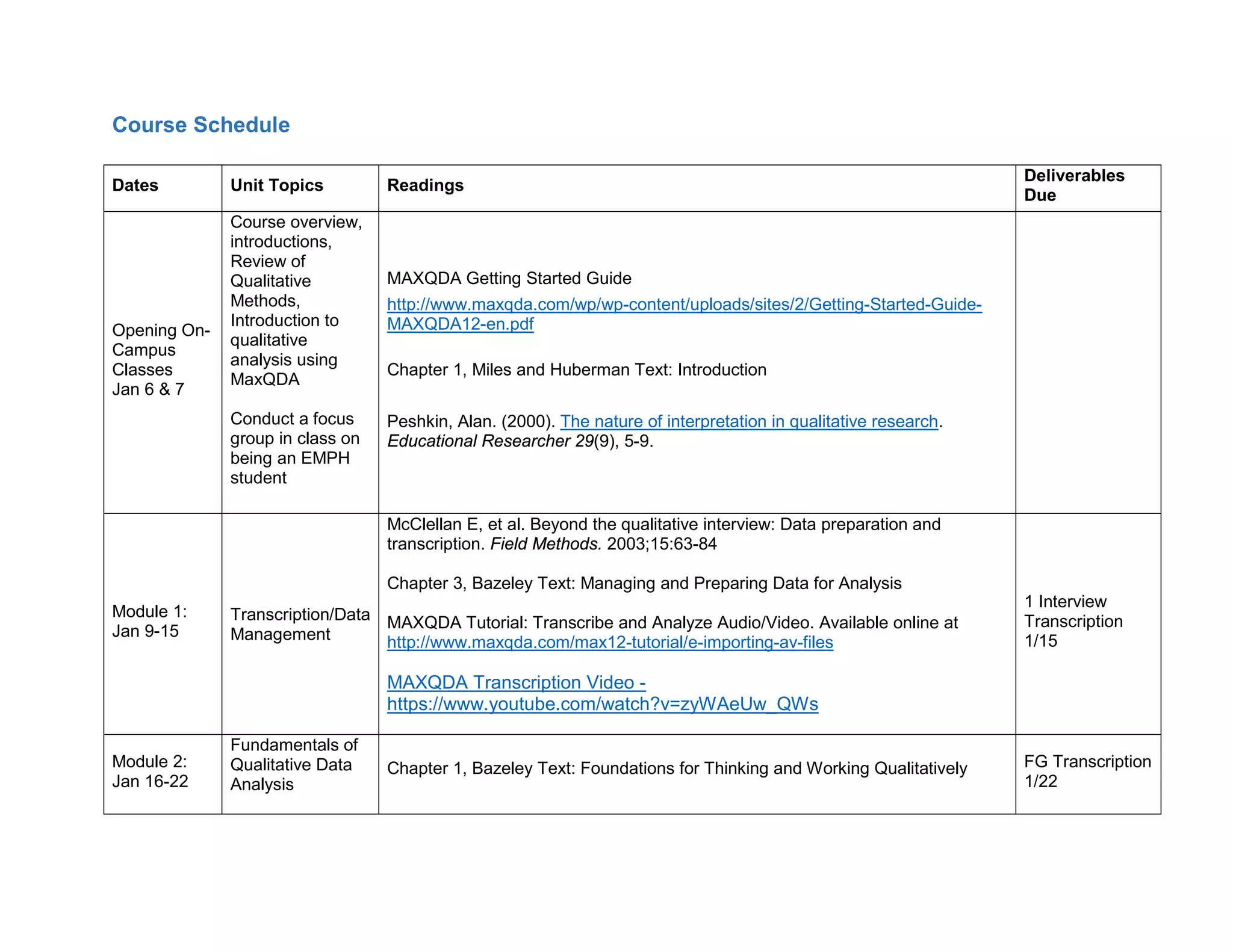 This document outlines the course schedule and requirements for an EMPH qualitative methods course. It includes 9 modules covering topics like qualitative data analysis using MAXQDA, transcription, coding, descriptive analysis methods, and writing qualitative papers. Assignments include transcribing an interview, developing memos and a coding assignment, creating a codebook, and a final presentation. The readings and tutorials provide guidance on qualitative research methods and using MAXQDA software to organize and analyze qualitative data.