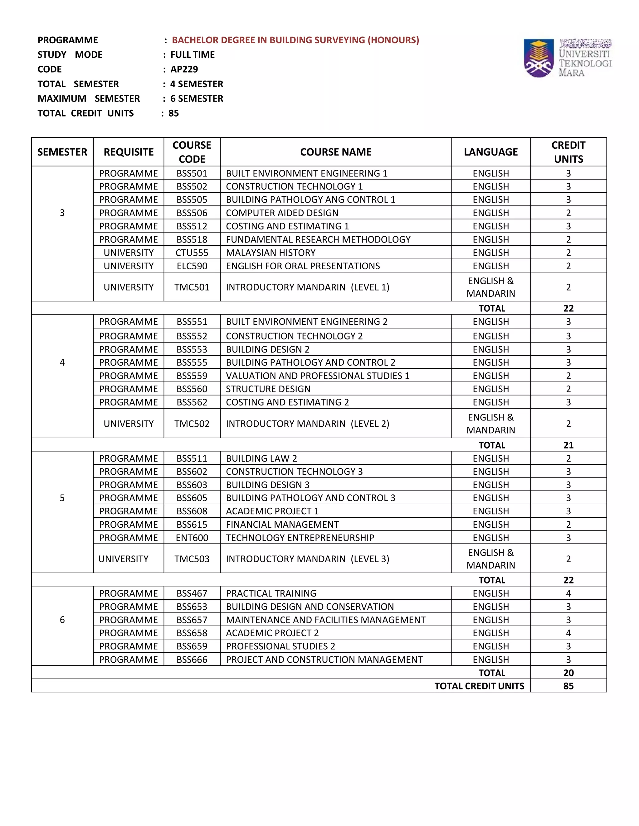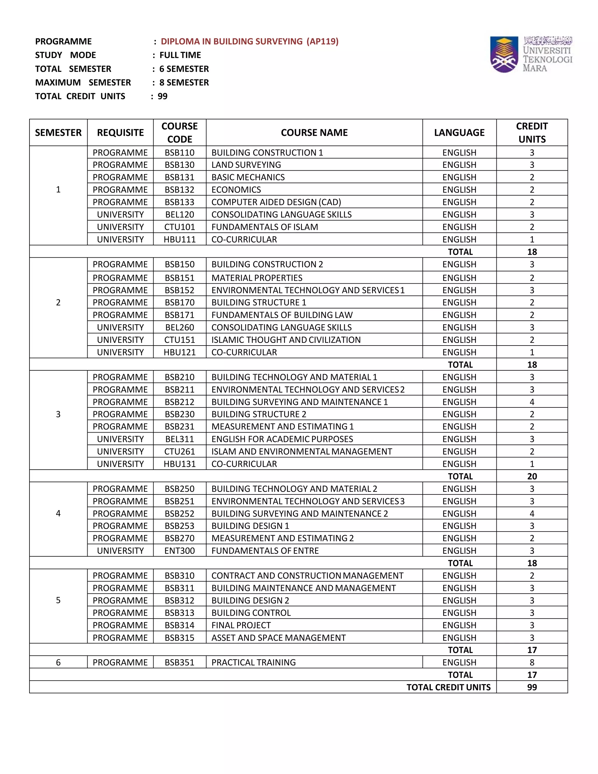 This document outlines the curriculum requirements for two building surveying programs - a Diploma in Building Surveying and a Bachelor's Degree in Building Surveying (Honours). The Diploma program is a full-time 6 semester program requiring 99 credit units, covering topics like building construction, land surveying, and measurement and estimating. The Bachelor's program is a full-time 4 semester program requiring 85 credit units, with courses focused on built environment engineering, construction technology, building pathology and control, and an academic project. Both programs include general education courses and a practical training component.
