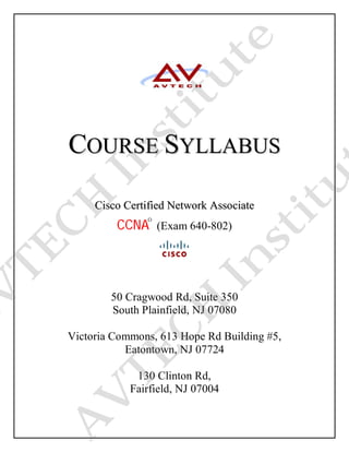 This 3-page document provides a course syllabus for the Cisco Certified Network Associate (CCNA) certification exam preparation course. The syllabus outlines the course objectives, which cover topics such as networking fundamentals, switching, routing, WAN technologies, security, and network management. It details the course structure, prerequisites, materials, evaluation methods, and requirements for successful completion. The goal of the course is to prepare students to pass the CCNA certification exam through hands-on labs and projects simulating real-world networking scenarios.