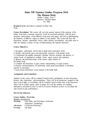 This course covers the anatomy and physiology of the human body through lectures, labs, dissections and presentations over three weeks. Students will learn anatomical terminology and the structures and functions of major body systems including integumentary, skeletal, muscular, nervous, respiratory, cardiovascular, digestive, urinary, reproductive and endocrine. Evaluation is based on class participation, weekly quizzes and presentations. Labs include microscopy, sheep brain and cow eye dissection, and a fetal pig dissection. The course aims to prepare students for health careers through hands-on learning and ethics discussions.