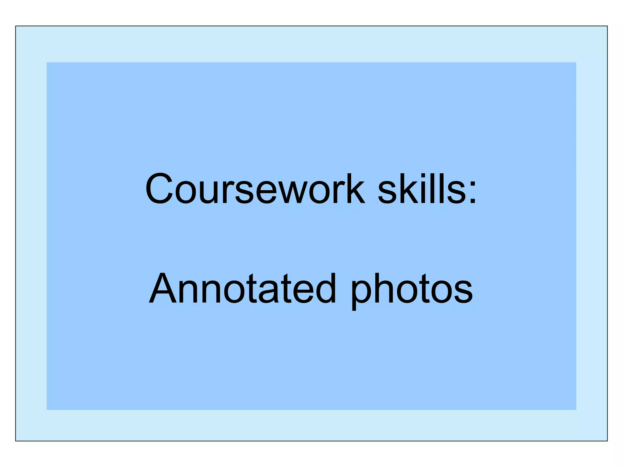 The document provides guidance for annotating photos as part of a coursework assignment. Students must choose two contrasting photos from different areas, such as the sea front and another location. They should add detailed annotations for each photo using keywords and referencing the photos in their written work. Students must work independently without discussing their coursework with others to ensure it reflects their own ideas.