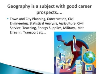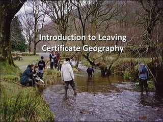 This document provides an introduction to the Leaving Certificate Geography course. It outlines the main topics covered, including physical geography, methods of analysis, and regional case studies. Students will study plate tectonics, landforms, and various world regions. Assessment involves a 20% fieldwork project and 80% final exam in June 2014. The exam focuses on significant relevant points relating to topics like structures of deformation and landforms.