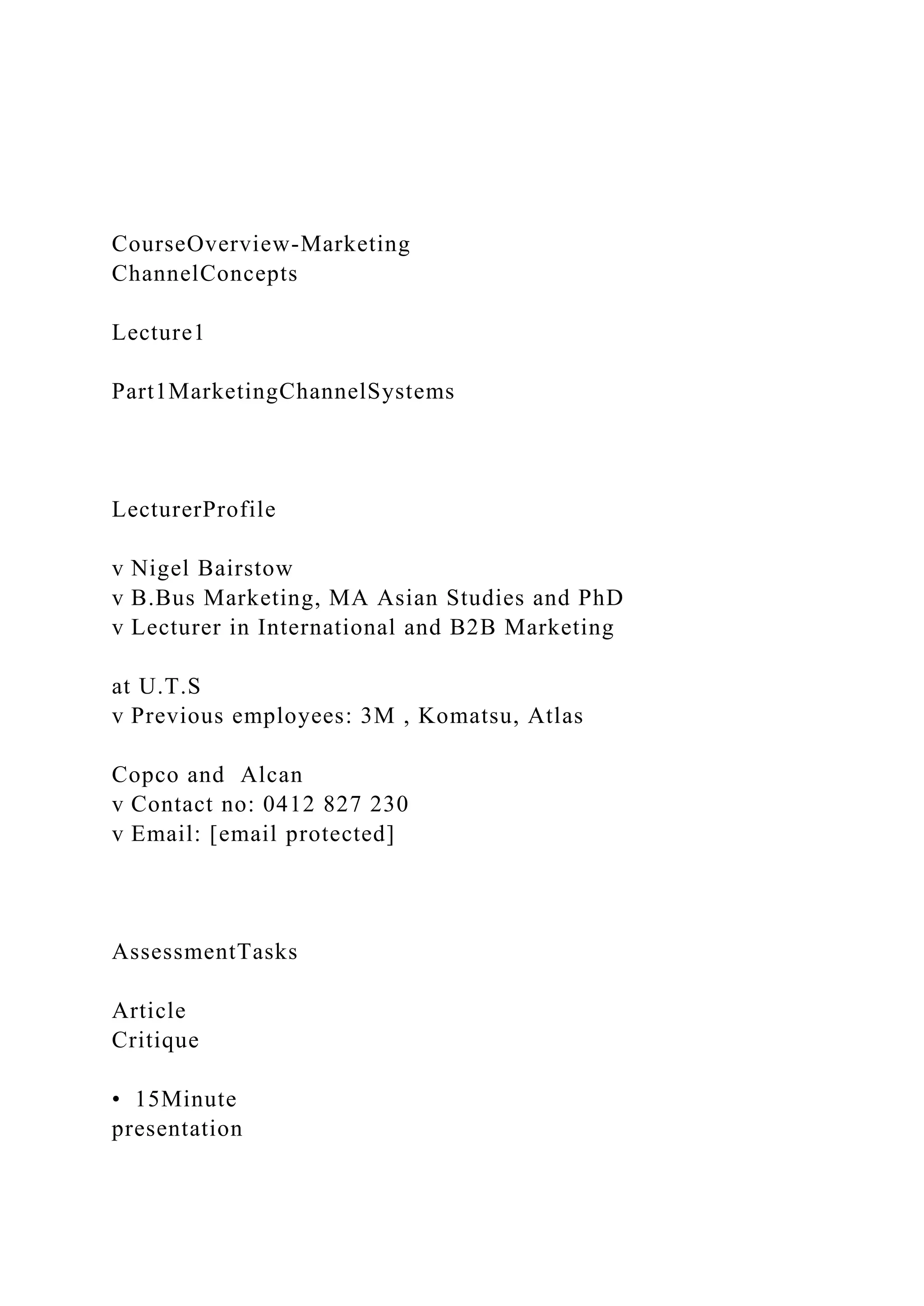 The document outlines a course on marketing channel concepts, highlighting key assessments, learning objectives, and the importance of distribution strategies in achieving competitive advantages. Students will explore the design and management of marketing channels, address complex channel problems, and understand the role of distribution in the marketing mix. Key themes include the significance of marketing channels, channel strategy formulation, and service output demands in satisfying end-user needs.