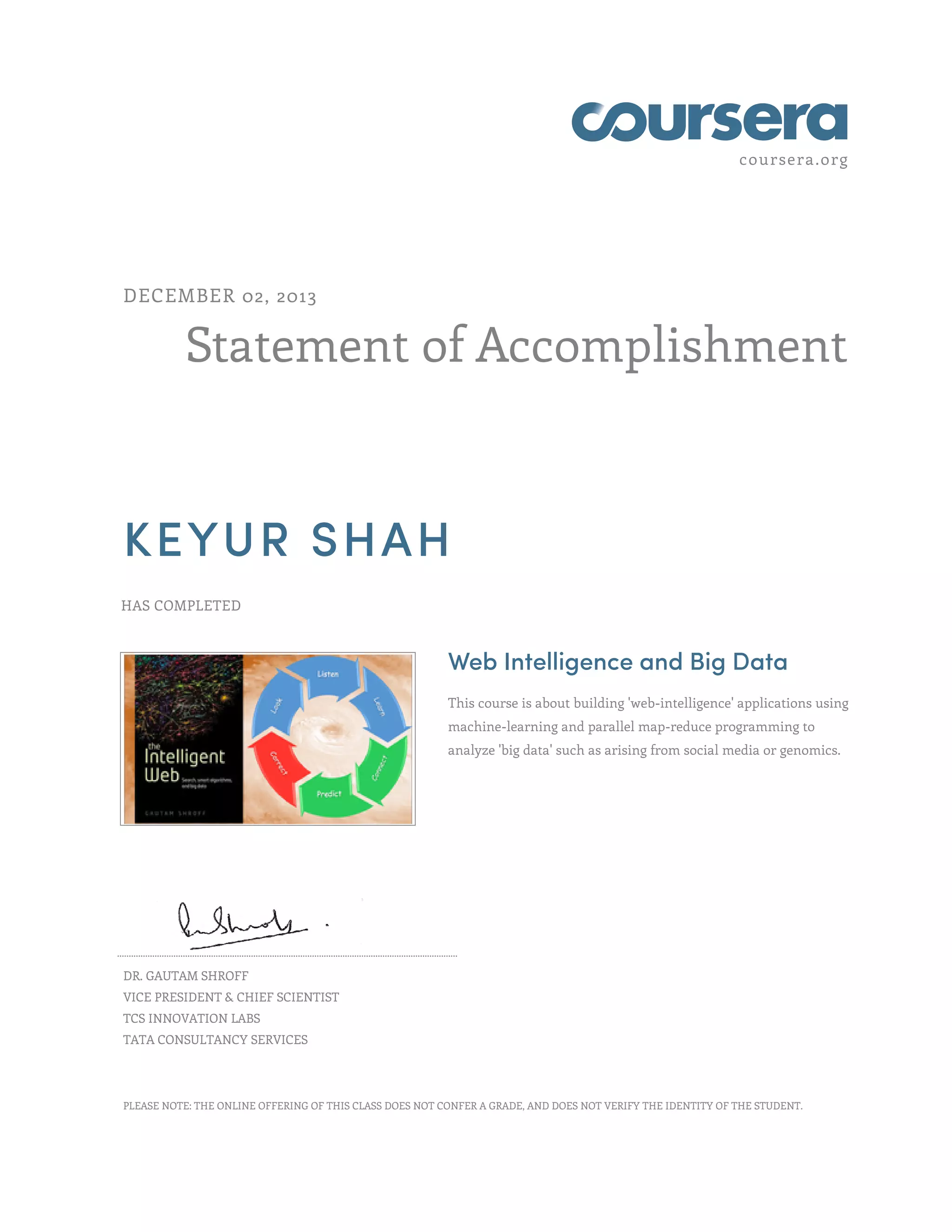 Keyur Shah completed a Coursera course on Web Intelligence and Big Data in December 2013. The course taught machine learning and parallel programming techniques for analyzing large datasets from sources like social media and genomics. It was led by Dr. Gautam Shroff, Vice President and Chief Scientist at Tata Consultancy Services' Innovation Labs.
