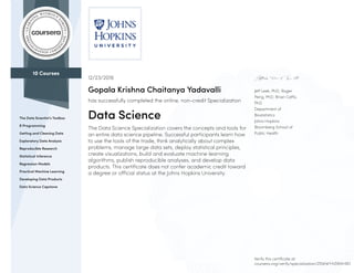 This document is a certificate of completion for the Data Science Specialization from Johns Hopkins University on Coursera. The specialization includes 10 courses covering topics like R programming, getting and cleaning data, exploratory data analysis, reproducible research, statistical inference, regression models, practical machine learning, developing data products, and a capstone. It provides an overview of the full data science pipeline and teaches skills for working with large datasets, statistical analysis, machine learning, and communicating results. This certificate does not confer academic credit but verifies completion of the online, non-credit specialization.