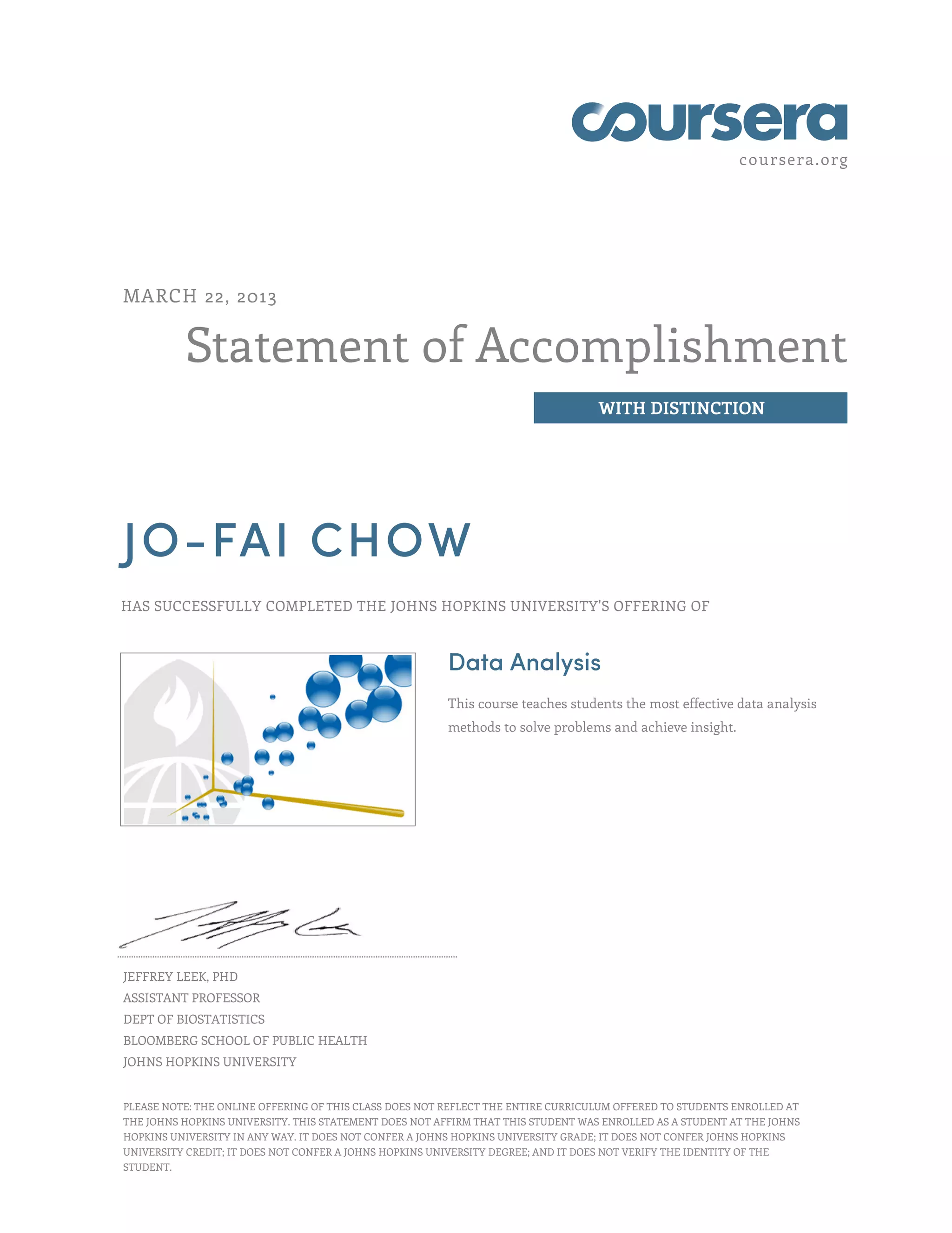 Jo-Fai Chow successfully completed the Coursera course "Data Analysis" from Johns Hopkins University with distinction. The course teaches effective data analysis methods to solve problems and gain insight. The certificate was issued by Jeffrey Leek, Assistant Professor of Biostatistics at Johns Hopkins Bloomberg School of Public Health.