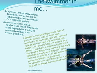 The document is a reflective piece by Charlotte Blacksley about her identity as both a swimmer and student. She discusses feeling more confident in her swimming costume than normal clothes. As a swimmer, she feels a need to succeed and set a good example for her siblings. Her daily routine involves waking up early for training. She notes having two different personalities as a student and swimmer, with different cultural practices for each role. Her family influenced her to take up swimming at a young age. Music also plays a big role in motivating her for competitions.