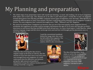 Rhapsody magazine uses conventions of real music magazines in its layout, content, and consistency. It follows conventions like having a bright masthead behind the cover image and including a skyline of artists. However, it also challenges conventions with its "Bringing elegance to music..." tagline and different masthead font. The contents page title "The IN-side" makes it distinct from typical "Contents" pages. Double page spreads use a simple layout like other magazines. Overall, Rhapsody develops and uses real magazine forms and conventions while adding some unique elements.