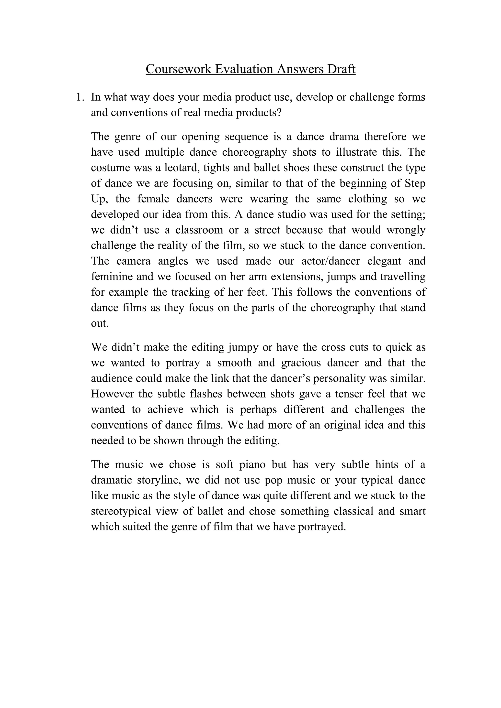 The document provides answers to questions about a media project creating a dance drama opening sequence. It describes how the sequence uses conventions of the genre like dance choreography shots, ballet costumes, and a dance studio setting. It challenges conventions somewhat through subtle tense edits. The distribution target is the American film industry due to their large budgets. The student learned skills using Adobe Premiere Pro, After Effects, and other technologies to film, edit, and construct the project.