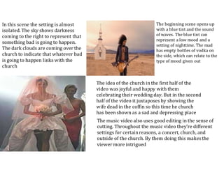 This document provides analysis of several music videos through summaries of individual scenes: