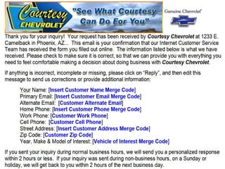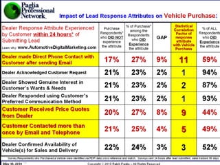 This document discusses best practices for managing sales leads from online inquiries. It provides data showing that responding to leads quickly, providing price quotes, confirming vehicle availability, showing genuine interest in the customer, and following up multiple times significantly increases closing ratios and vehicle purchases. It emphasizes the importance of a well-defined lead management process that incorporates these practices.