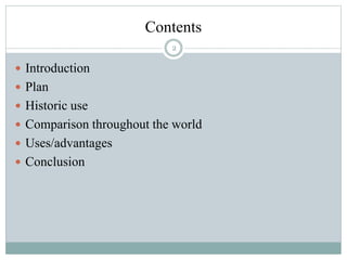 The document discusses the courtyard system. It provides a brief history of courtyards beginning in 6000 BC and describes how they have been used for various purposes over time and in different cultures around the world. The key advantages of the courtyard system are that it provides proper air circulation, maintains thermal comfort, and is more eco-friendly. Examples of courtyard styles from Rome, Greece, China, Islamic regions, Europe, India, and Nepal are highlighted.