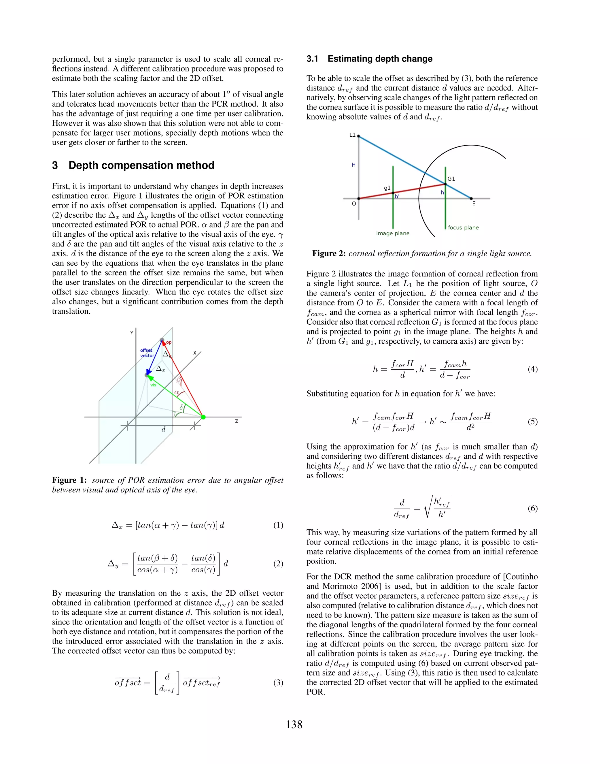The document presents a new method called depth compensation cross-ratio (dcr) for improving the accuracy of traditional cross-ratio (tcr) eye tracking techniques which struggle with head movements. The dcr method enhances gaze estimation by compensating for angular discrepancies between the optical and visual axes, achieving an average improvement of 40% in synthetic data and 8% in real data. The proposed technique retains the simplicity of previous methods, requiring only a one-time calibration per user.