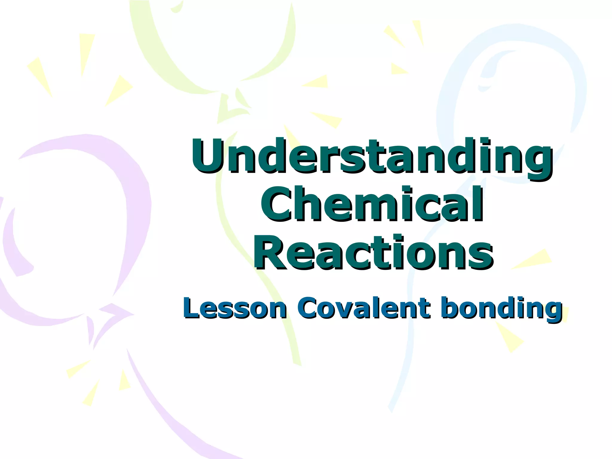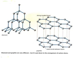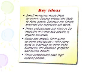 Covalent bonding occurs when two non-metal atoms share electrons in their outer shells to gain a stable electron configuration. Chlorine exists as Cl2 molecules where each chlorine atom shares one electron with the other to fill its outer shell. Oxygen also exists as O2 molecules where each oxygen atom shares two electrons in a double bond to fill its outer shell. Covalent compounds have strong bonds within their molecules but weak intermolecular forces, which explains their low melting points and why many exist as gases.