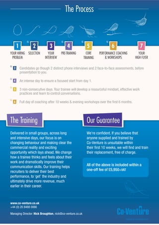 Co-Venture provides recruitment coaching and selection services to help clients hire the right candidates. However, current selection methods often fail to identify candidates with traits like tenacity, self-confidence and drive that are needed for success. Co-Venture's selection process involves multiple interviews and assessments to evaluate candidates. Their training then focuses on changing candidates' mindsets and behaviors through intensive multi-day programs to prepare them for successful careers in recruitment. Co-Venture guarantees they will re-train a replacement at no cost if the initially trained candidate is unsuitable within the first 10 weeks.