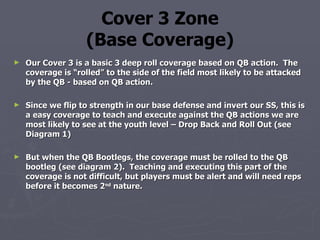 This document describes a Cover 3 zone defense and how it adjusts based on the quarterback's actions. The coverage rolls to the side of the field that the quarterback is most likely to attack. When the quarterback drops back or rolls out, the coverage rolls to that side. However, when the quarterback bootlegs, the coverage must roll to the bootleg side instead. While not difficult, players will need repetitions for this adjustment to the quarterback bootleg to become second nature.
