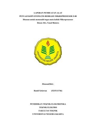 Dokumen ini adalah laporan pembuatan alat penyaji kopi otomatis menggunakan mikroprosesor Z-80. Laporan disusun oleh Randi Setiawan sebagai tugas mata kuliah Mikroprosesor di bawah bimbingan Drs. Yusuf Bintoro dari Fakultas Teknik Universitas Negeri Jakarta.