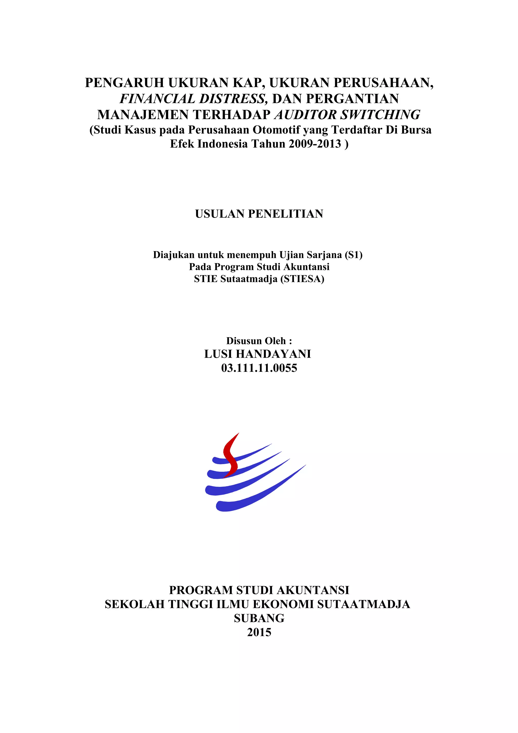 Penelitian ini menganalisis pengaruh ukuran kapitalisasi pasar, ukuran perusahaan, financial distress, dan pergantian manajemen terhadap keputusan perusahaan untuk mengubah auditor. Penelitian menggunakan data perusahaan otomotif yang terdaftar di Bursa Efek Indonesia antara tahun 2009-2013. Hasilnya diharapkan memberikan pemahaman tentang faktor-faktor yang mempengaruhi keputusan perusahaan untuk mengubah auditor.