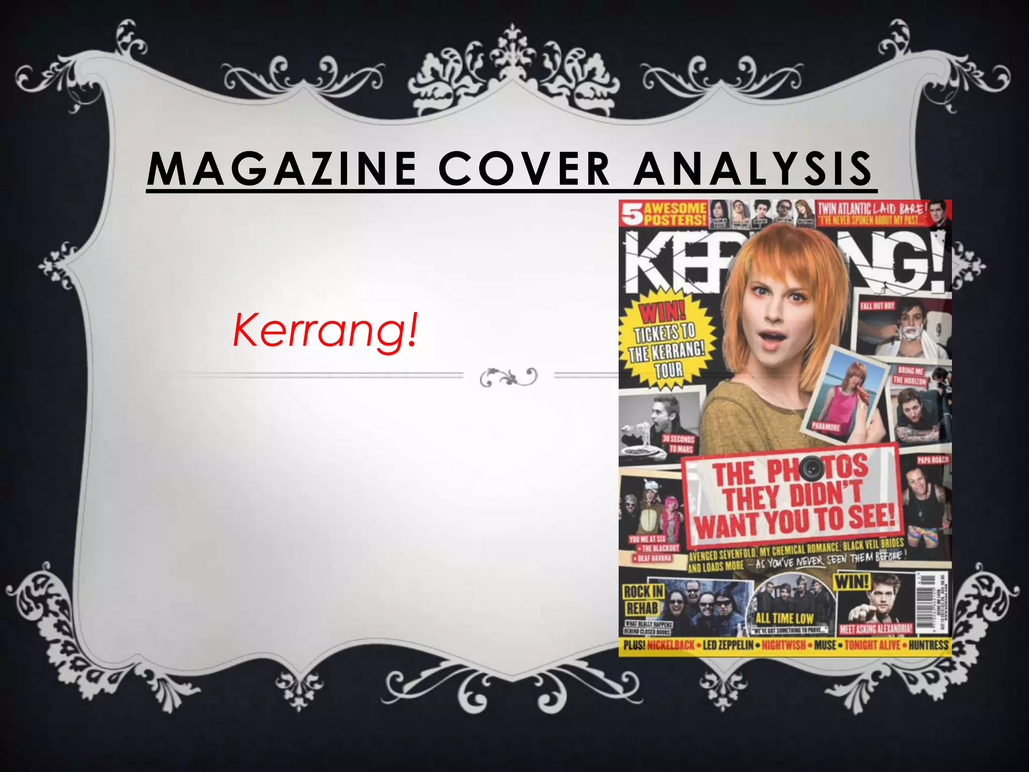 This document analyzes and compares the cover designs of two rock music magazines: Kerrang! and Rock Sound. For Kerrang!, the masthead is obscured by the central image of Paramore's Hayley Williams, implying brand recognition. Intriguing text and band names scattered around draw readers' attention. Rock Sound uses a calming color scheme and varying fonts to seem mature yet fun. Its central image emphasizes an above-shot band to appear relatable. Both magazines attract readers through prominent placement of band names rather than extensive coverlines.