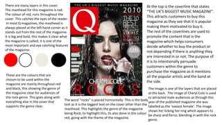 The magazine cover uses red and black colors throughout to signal its rock genre focus. The large masthead in the top left identifies it as Q Magazine, while additional text lines promote the magazine's content and popular artists. Centered below is the word "rocks" in red to further highlight the genre. The back image depicts Cheryl Cole, intended to attract male audiences. Together these visual elements clearly brand the magazine and aim to persuade potential customers within the rock music category.