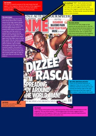 This magazine cover features British rapper Dizzee Rascal as the main image. He is posing in typical hip-hop fashion wearing baggy jeans, a vest top, and gold chains in front of a graffiti-covered wall. The large caption identifies him and quotes "I'm spreading joy around the world, man" in bold text below. Additional information in the footer promotes other artists to be featured in the magazine using bold text separated by points in black. Overall the design draws attention to Dizzee Rascal as the featured artist through his image and bold captions while hinting at other hip-hop content through graphic elements and additional artist names.