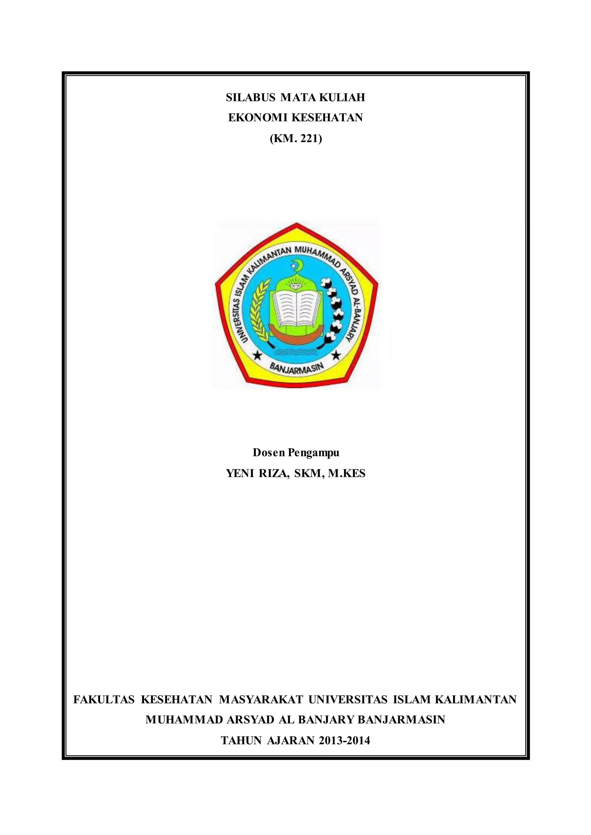 This document is a syllabus for the course "Health Economics" taught at the Faculty of Public Health, Muhammad Arsyad Al Banjary Islamic University of Kalimantan. It lists the lecturer Yeni Riza and provides the academic year as 2013-2014.