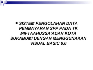 Dokumen ini membahas sistem pengolahan data pembayaran SPP di TK Miftaahussa'adah menggunakan Visual Basic 6.0, yang bertujuan untuk menggantikan proses manual yang lambat dan rawan kesalahan dengan sebuah sistem terkomputerisasi yang lebih efisien. Identifikasi masalah mencakup penginputan data dan pelayanan pengolahan, dengan fokus pada kemudahan dan kecepatan bagi pengguna. Penelitian ini dilakukan antara 1 Agustus hingga 30 Oktober 2008 dengan harapan meningkatkan kualitas pelayanan melalui teknologi informasi.
