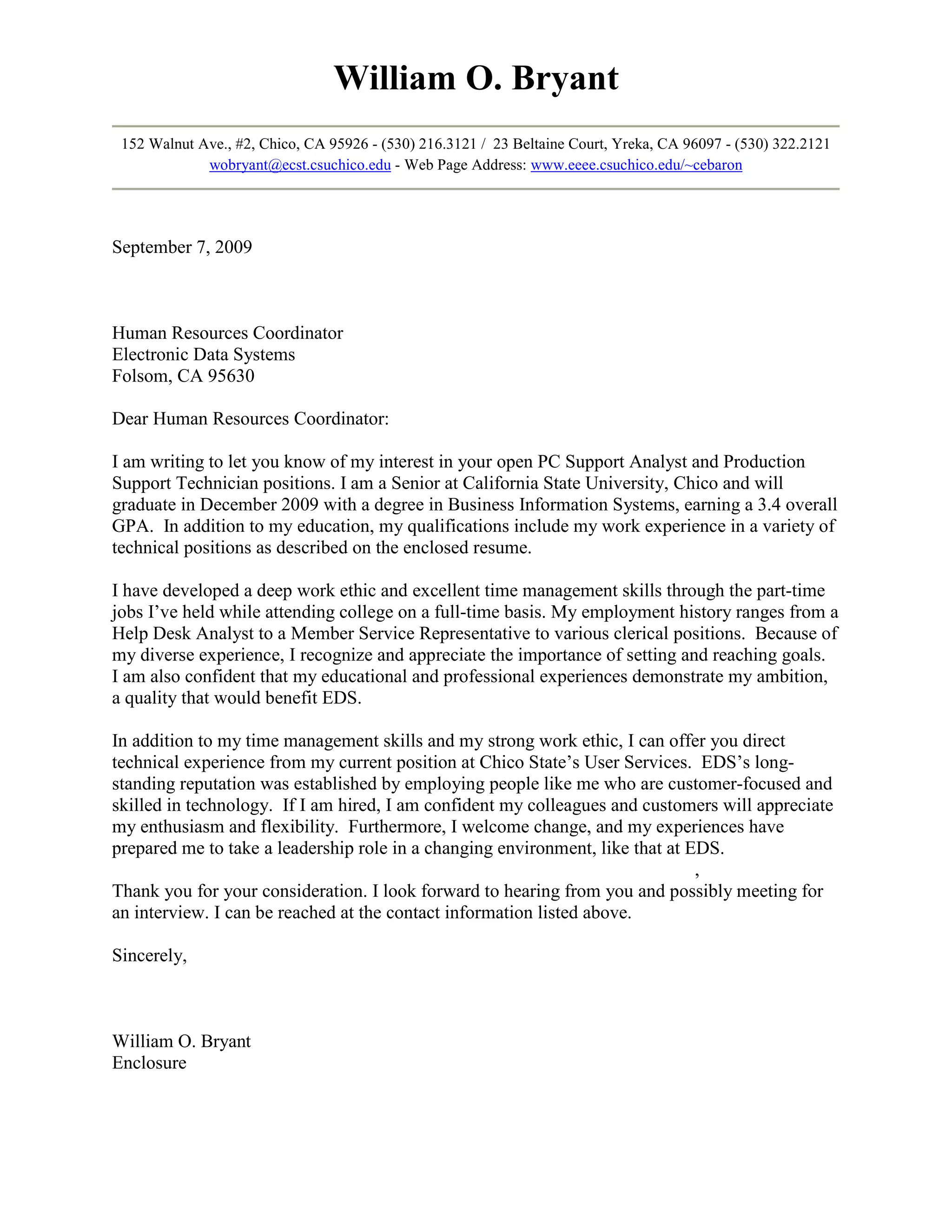 William O. Bryant is applying for open PC Support Analyst and Production Support Technician positions at Electronic Data Systems. He will graduate in December 2009 from California State University, Chico with a degree in Business Information Systems and a 3.4 GPA. Bryant has work experience in help desk, member services, and clerical roles that have given him strong time management and work ethic skills. He believes his technical and customer service experience from his current job at Chico State's User Services makes him a good fit for EDS's reputation of employing flexible, technology-skilled and customer-focused people. Bryant is confident his colleagues and customers would appreciate his enthusiasm and ability to take a leadership role in a changing environment.